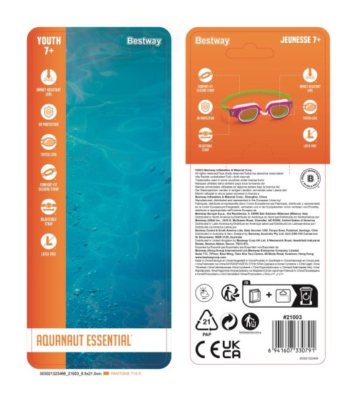 Moderné plavecké okuliare s bezpečnostnými šošovkami. Pohodlné tvarované košíčky na oči pre dokonalú tesnosť. Upraviteľný opasok pre bezpečné a pohodlné nosenie. 3 rôzne farebné prevedenia. Pre deti od 7 rokov.