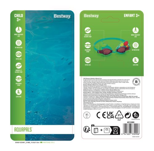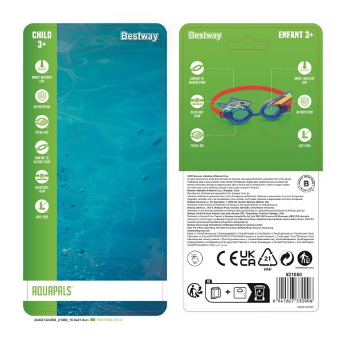 Moderné plavecké okuliare vo veselom dizajne s bezpečnostnými šošovkami. Pohodlné tvarované košíčky na oči pre dokonalú tesnosť. Upraviteľný opasok pre bezpečné a pohodlné nosenie. 3 rôzne farebné prevedenia. Pre deti od 3 rokov.