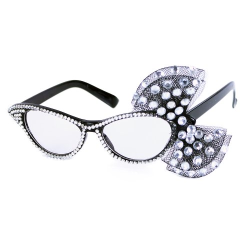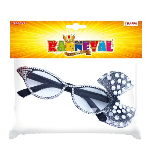 Elegantné karnevalové okuliare v čiernej farbe sú zdobené kamienkami a mašľou. S týmto doplnkom na očiach budete na párty za hviezdu!
