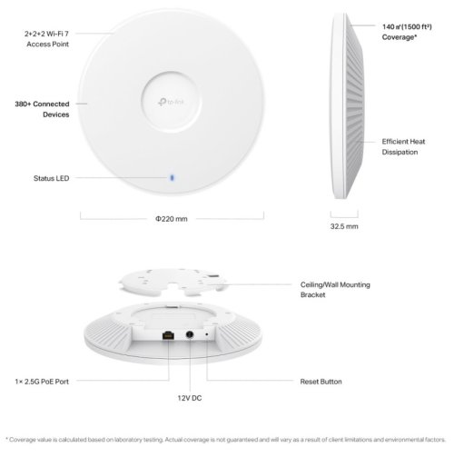 Tripásmový prístupový bod s Wi-Fi 7 BE9300 pre montáž na strop BE9300 Tri-Band Wi-Fi 7 (5760 Mbps na 6 GHz + 2880 Mbps na 5 GHz + 574 Mbps na 2,4 GHz).† Čisté pásmo 6 GHz, čistejšie pásmo 6 GHz. uvoľňuje plný potenciál Wi-Fi 7. Šírka pásma 320 MHz umožňuje oveľa viac súčasných prenosov.‡ Prevádzka s viacerými linkami a viacerými jednotkami zabezpečuje vysoký výkon vašej siete.‡ Pokročilé funkcie: Centralizovaná správa, mesh a AI roaming.