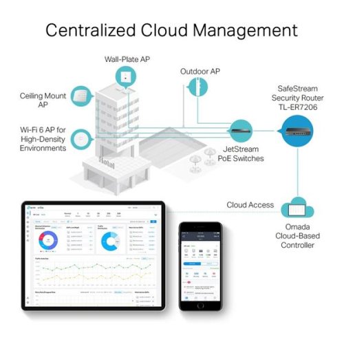 Profesionálna, bezpečná a spoľahlivá brána s možnosťou centralizovanej správy. Ako brána, ktorá sa bezproblémovo integruje do platformy Omada Software Defined Networking (SDN), umožňuje TL-ER7206 vzdialenú a centralizovanú správu kdekoľvek a kedykoľvek. K maximalizácii pohodlia je k dispozícii aj samostatná správa prostredníctvom webového používateľského rozhrania alebo aplikácie.