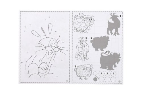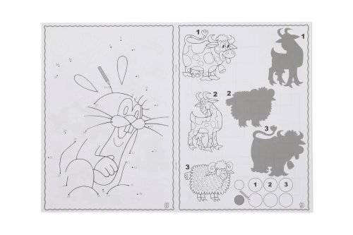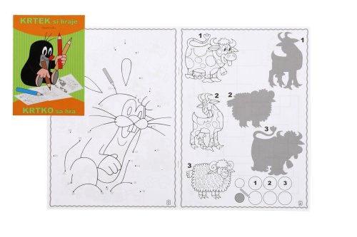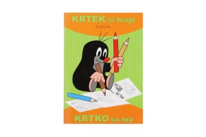 Omaľovánky A4 s motívom Krtka. Obálka + 16 vnútorných strán, z toho 8 farebných predlôh a 8 zodpovedajúcich kontúr.