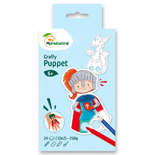 Omaľovánky Avenue Mandarine Graffy Puppet s motívmi drakov a rytierov. Omaľovánky vopred pripravené a upravené na následné použitie ako prstové bábky, stačí ich vyfarbiť a hrať sa. Omaľovánky obsahujú 24 listov, 12 motívov po 2 ks, krúžková väzba. Možno použiť na techniky: pastelky, fixky, akvarel atď. Gramáž 250 g. Vhodné pre deti už od 5 rokov,, Rozmery 10 x 20 cm