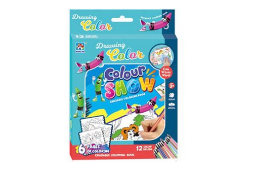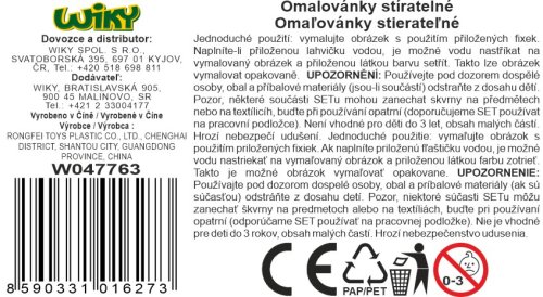 Omaľovánky, stierateľné, 6 obrázkov. Rozmery 17x17 cm. Balenie obsahuje 12 fixiek a handričku.