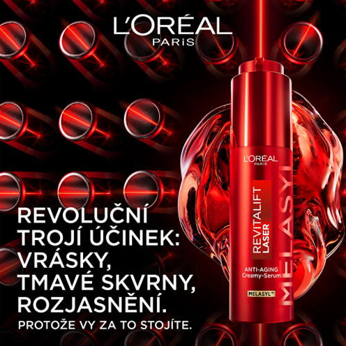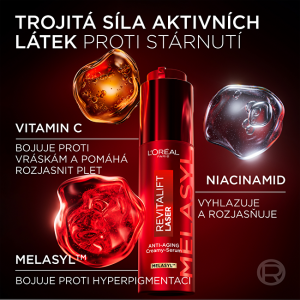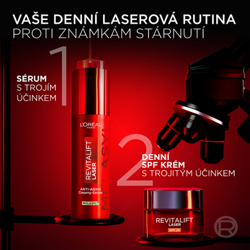 Omladzujúce krémové sérum Revitalift Laser s obsahom patentovanej látky Melasyl™ účinne redukuje hlboké vrásky, rozjasňuje pleť a pôsobí proti tmavým škvrnám. Pokročilé zloženie sa zameriava na korekciu pigmentových nedokonalostí a zjednotenie tónu pleti. Spojením inovatívnej technológie a silných aktívnych látok vznikol produkt s viditeľným účinkom už počas krátkej doby používania.