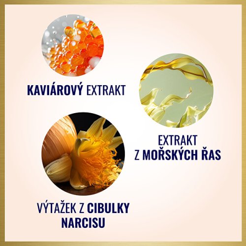 Očník krém s výťažkom z kaviáru, ktorá obnovuje a regeneruje bunkovú štruktúru pleti okolo očí a spomaľuje proces starnutia. Extrakt z cibuľky narcisu vyrovnáva hlboké vrásky, spevňuje pleť okolo očí a zvyšuje jej elasticitu. Omega 3 a 6 mastné kyseliny vyživujú jemnú pleť okolo očí a napomáhajú pri obnove kožnej bariéry. Kaviárový krém pomáha redukovať jemné linky a vrásky, zlepšuje textúru pleti.