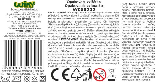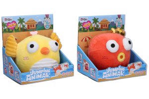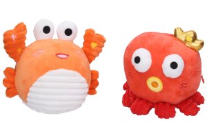 Opakovacie zvieratko. Veľkosť 15cm. Stlačením klepítka (krab), korunky (červená chobotnica), krídla (kurča) alebo čiapky (modrá chobotnica) sa spúšťa nahrávanie a zvieratko rovno opakuje čo počuje. Ďalším stiknutím sa zapnú pesničky, ďalším opäť nahrávanie atď. Vypína sa on/off prepínačom vo vnútri zvieratka. Zozadu má zips. 3xAAA batérie nie sú súčasťou. 4 varianty - krab, kura, modrá chobotnica, červená chobotnica