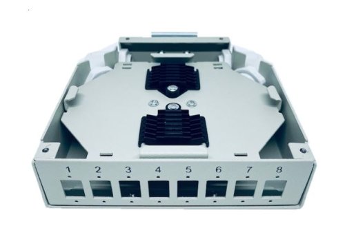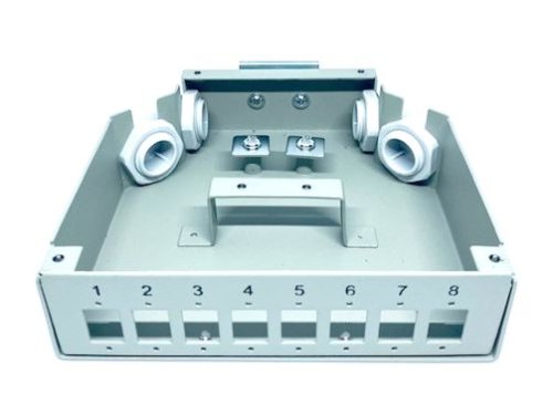 Popis produktu Optický rozvádzač/box pre umiestnenie na DIN lištu šedej farby pre max. 8 SC simplex spojok, kovový so skrutkovateľným vekom pre zakončenie max. 12 optických vlákien. Box má 4 káblové vstupy a dodáva sa s 2 káblovými priechodkami, držiaky zvarov neosadený spojkami.