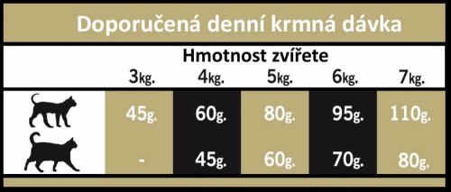 Ľahko stráviteľné sacharidy , pre zaistenie kvalitnej srsti, kože a podporu trávenia . Obsah omega 3 a 6 esenciálnych mastných kyselín pre správne fungovanie mozgu a optimálnu kondíciu kardiovaskulárneho systému . Obsah zinku napomáha udržiavať zdravú kožu a lesklú srsť . FOS + MOS s prebiotickými účinkami prispieva k zdraviu tráviaceho traktu. Obsahuje iba prírodné konzervanty a antioxidanty. Optimálny pomer vápnika a fosforu pre zdravé, silné zuby bez zubného povlaku.