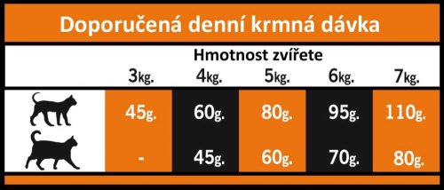 Doplnkové látky v 1 kg: Vitamín A 18.000 MJ . / mg, Vitamín D3 1.1.500 MJ . / mg, Vitamín E 750 mg, Vitamín C 75 mg, L-taurín 975 mg, DL-metionín 500 mg, železo (síran železnatý monohydrát) 100 mg, jód (jodid draselný) 3,5 mg, meď (síran mdeďnatý penta 10 mg, mangán (síran mangánatý monohydrát) 8 mg, zinok (oxid zinočnatý) 155 mg, selén (seleničitan sodný) 0,2 mg, exktrakt z juky 150 mg, citrusové extrakty bohaté na bioflavonoidy 1.000 mg.