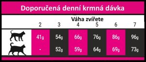 Analytické zložky: hrubý proteín 33,00 %, hrubý tuk 15,00 %, omega-3 mastné kyseliny 0,25 %, omega-6 mastné kyseliny 2,50 %, hrubá vláknina 3,00 %, hrubý popol 7,70 %, vápnik 1,75 %, Metabolizovateľná energia 3853 kcal/kg.