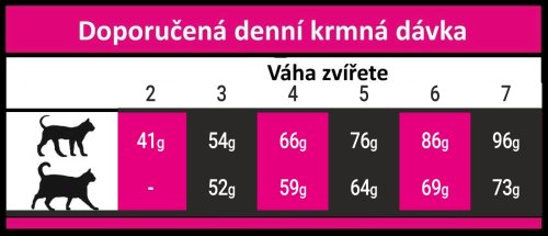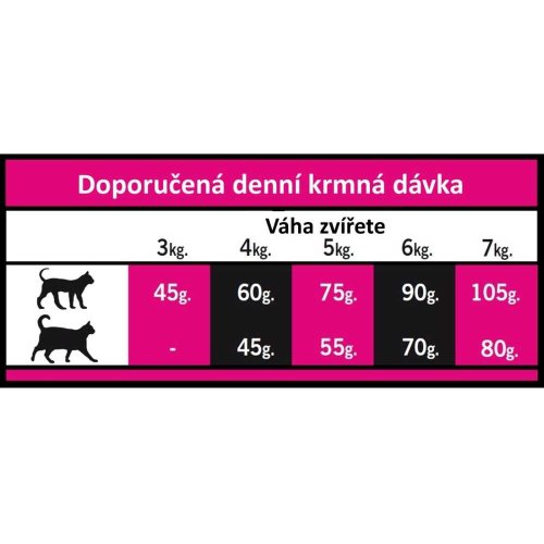 Ľahko stráviteľné sacharidy , pre zaistenie kvalitnej srsti, kože a podporu trávenia . Obsah omega 3 a 6 esenciálnych mastných kyselín pre správne fungovanie mozgu a optimálnu kondíciu kardiovaskulárneho systému . Obsah zinku napomáha udržiavať zdravú kožu a lesklú srsť . FOS + MOS s prebiotickými účinkami prispieva k zdraviu tráviaceho traktu. Vysoká kvalita rôznych druhov mäsa, olejov a extraktov robí krmivo veľmi chutné aj pre vyberavé mačky.