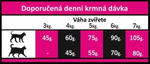 Ľahko stráviteľné sacharidy , pre zaistenie kvalitnej srsti, kože a podporu trávenia . Obsah omega 3 a 6 esenciálnych mastných kyselín pre správne fungovanie mozgu a optimálnu kondíciu kardiovaskulárneho systému . Obsah zinku napomáha udržiavať zdravú kožu a lesklú srsť . FOS + MOS s prebiotickými účinkami prispieva k zdraviu tráviaceho traktu. Vysoká kvalita rôznych druhov mäsa, olejov a extraktov robí krmivo veľmi chutné aj pre vyberavé mačky.