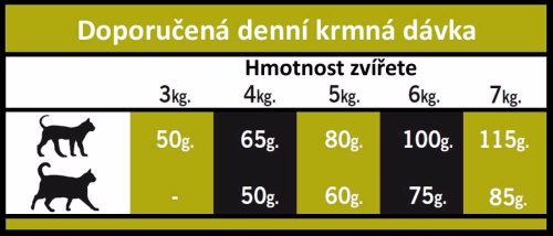 Doplnkové látky v 1 kg: Vitamín A 18.000 MJ . / mg, Vitamín D3 1.500 MJ . / mg. Vitamín E 500 mg. Vitamín C 65 mg, L-taurín 950 mg, DL-metionín 500 mg, železo (síran železnatý monohydrát) 204 mg, jód (jodid draselný) 3,5 mg, meď (síran mdeďnatý pentahydrát) 10 mg, mangán (síran ) 9 mg, zinok (oxid zinočnatý) 150 mg, selén (seleničitan sodný) 0,23 mg, citrusové extrakty bohaté na bioflavonoidy 1000 mg, extrakt z juky 170 mg.