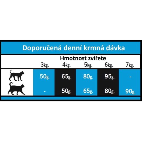 Doplnkové látky v 1 kg: Vitamín A 19.000 MJ . / mg. Vitamín D3 1.600 MJ . / mg. Vitamín E 600 mg. Vitamín C 65 mg, L-taurín 1.000 mg, L-karnitín 240 mg, DL-metionín 500 mg, železo (síran železnatý monohydrát) 195 mg, jód (jodid draselný) 3,5 mg, meď (síran mdeďtý0 , mangán (síran manganatý monohydrát) 9 mg, zinok (oxid zinočnatý) 150 mg, selén (seleničitan sodný) 0,23 mg, citrusové extrakty bohaté na bioflavonoidy 1000 mg, extrakt z juky 150 mg, konjugovaná kyselina 6 mg.