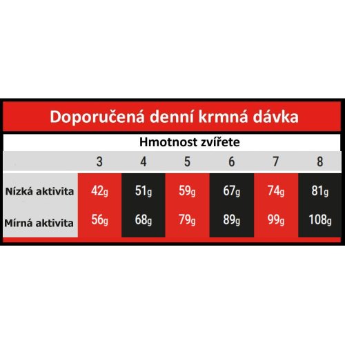 Analytické zložky : Hrubý proteín 30%, hrubý olej a tuky 13%, mastné kyseliny omega 6: 3%, mastné kyseliny omega 3: 0,25%, hrubá vláknina 3%, hrubý popol 7%, vápnik 1%, fosfor 0,9%, energia 37.