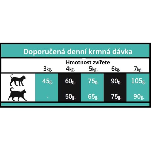 Ľahko stráviteľné sacharidy , pre zaistenie kvalitnej srsti, kože a podporu trávenia . Obsah omega 3 a 6 esenciálnych mastných kyselín pre správne fungovanie mozgu a optimálnu kondíciu kardiovaskulárneho systému . Obsah zinku napomáha udržiavať zdravú kožu a lesklú srsť . FOS + MOS s prebiotickými účinkami prispieva k zdraviu tráviaceho traktu.