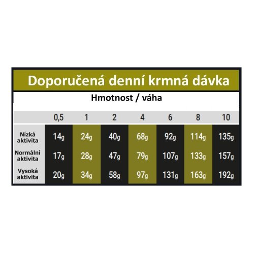 Analytické zložky: hrubý proteín 30 %, hrubý olej a tuky 18 %, EPA + DHA 400 mg/kg, Omega-3 mastné kyseliny 0,50 %, Omega-6 mastné kyseliny 1,45 %, hrubá vláknina 3,50 %, hrubý popol 7,5 %, 0,0 Metabolizovateľná energia: 3 947 kcal/kg.