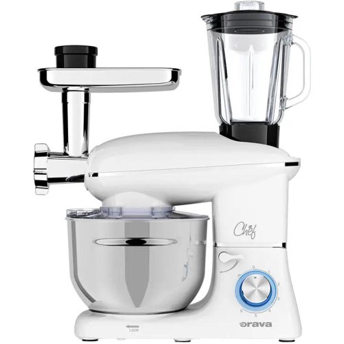 Obsahuje: Mlýnek na maso Mixér Hnětací hák Šlehací balónová metla Metla na míchání Nerezová mísa Kryt na mísu