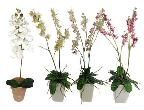 Umelá kvetina imitujúca orchidea. Obsahuje dva výhony s kvetmi tohto kvetu v kvetináči. Materiál: textílie, plast. Veľkosť: 65 cm. Farba: mix farieb bielo-žltá, bielo-ružová, ružovo-biela.