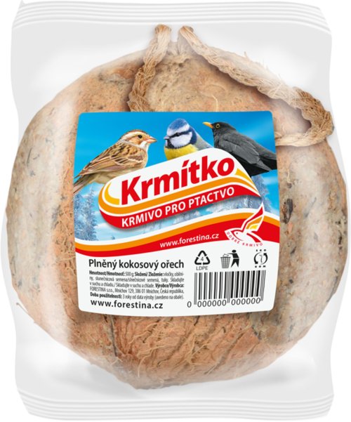 Doplnkové krmivo vo forme plneného kokosového orecha je vhodné pre vonkajšie vtáctvo v zimných mesiacoch. Možno ho zavesiť na vetvu stromu. Zloženie: vločky, obilniny, slnečnicové semená. Hmotnosť: 500 g.