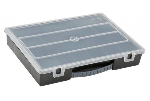 Základný organizér s transparentným vekom. Komfortná rukoväť. Odľahčené plastové telo. Pevné priehradky.