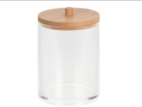 Transparentný zásobník na vatové tyčinky s bambusovým viečkom sa hodí do každej kúpeľne alebo na kozmetický stolík.