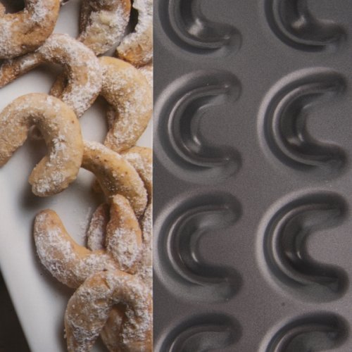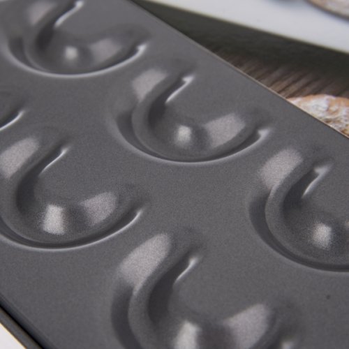 Plech na krehké valilkové rožteky, polomáčané orechové rohlíčky a iné cukrovinky tohto tvaru, s kvalitným nepriľnavým povrchom, ktorý bráni pripečeniu, a to aj pri použití minimálneho množstva tuku.