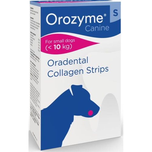 Žuvacie kolagénové plátky pre psy obsahujúce prírodné enzýmy. Žuvacie plátky pre psov z kolagénu, ktorý prirodzene stimuluje žuvanie. Sú účinné na prevenciu zubného povlaku a na zvýšenie pevnosti ďasien. Obsahujú sušenú srvátku – prírodný zdroj laktoperoxidázy a laktoferínu. Zloženie: hovädzia koža, hydrolyzovaný kukuričný lepok, srvátkový prášok. Analytické zložky: hrubý proteín 75,1 %, hrubý tuk 4,10 %, hrubá vláknina < 0,5 %, hrubý popol 4,50 %, vlhkosť 13,3 %. Dávkovanie: Podávajte plátky psovi každý večer po poslednom jedle. Plátok nechajte psovi žuť po dobu 10 – 15 minút, potom plátok psovi odoberte. Odporúčame čistiť zuby denne Orozyme zubným gélom. Starostlivo dodržujte rady vášho veterinárneho lekára o dentálnej a ústnej hygiene. Upozornenie: Buďte opatrní u hltavých psov. Nedostatočné žuvanie môže viesť k duseniu alebo zvracaniu. Prispôsobte veľkosť plátku váhe psa a sledujte správanie pri žuvaní. U hltavých psov je najvhodnejšie podávať plátok po jedle. Skladovanie: Skladujte v suchu pri izbovej teplote. Balenie vždy starostlivo uzavrite.