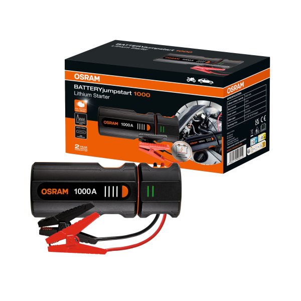 OSRAM BATTERYjumpstart 1000 dokáže naštartovať vozidlá s motormi do 5 l benzínu alebo 2 l nafty. Vďaka štartovaciemu výkonu 1000 A je vhodný pre väčšinu 12V osobných automobilov, dodávok, SUV a ľahkých úžitkových vozidiel. Funkcia Boost umožňuje naštartovanie úplne vybitých batérií. Unikátne ergonomické pripojenie s inteligentnou svorkou je vybavené dlhšími káblami pre lepšiu dostupnosť v ťažko prístupných miestach. Medzi bezpečnostné funkcie patrí ochrana proti prepólovaniu, ochrana proti výboju a ochrana proti skratu so zvukovými a LED indikátormi. Integrované svietidlo osvetľuje pracovný priestor a LED indikátory ukazujú aktuálny stav nabitia batérie. Prístroj je vybavený technológiou rýchleho nabíjania PD30W pre rýchlejšie dobíjanie a výkonné nabíjanie mobilných zariadení prostredníctvom portov USB C a USB A.