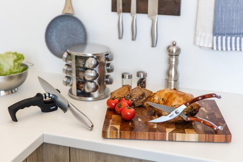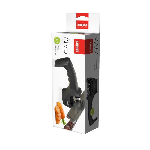 Brúska na nože ALIVIO 3 v 1 je určená na brúsenie klasických oceľových kuchynských nožov. Je vyrobený z ABS plastu so soft touch povrchovou úpravou a protišmykovou základňou pre jednoduchú a bezpečnú manipuláciu. Brúska je určená pre pravákov aj ľavákov a má 3 brúsne kamene. Diamantový kameň slúži na opravy poškodených čepelí a ich vyrovnávanie pred brúsením. Volfrámový kameň zaistí zostrenie čepele a obnovenie ostria do optimálneho tvaru. Tretí kameň je keramický a je určený na leštenie čepele a vyrovnanie povrchových nerovností.