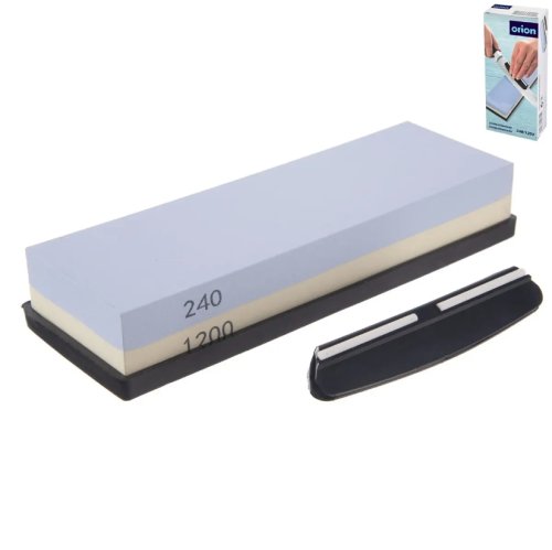 Kvalitný kombinovaný brúsny kameň so silikónovou protišmykovou podložkou as vodiacou svorkou s keramickými valčekmi. Tá pri brúsení napomáha lepšiemu udržaniu konštantného sklonu čepele noža voči brúsnemu kameňu. 2 stupne zrnitosti: modrý 240 je určený na odstránenie hrubších triesok z poškodenej čepele – základné univerzálne brúsenie, žltý 1200 na jemné finálne dobrusovanie a leštenie. Je vhodný na brúsenie nožov, nožníc, náradia na opracovanie dreva a záhradníckeho náčinia. Bez použitia svorky sa snažte brúsiť čepeľ pod uhlom 15-20 °. Pred brúsením sa odporúča kameň namočiť do vody cca na 10 minút. Aj počas brúsenia je vhodné kameň vlhčiť. Po použití nechajte voľne vyschnúť a uskladnite. Materiál korund (kameň), silikón (podložka), plast ABS, keramika. Rozmery: samotný kameň 18 x 6 x 3 cm, s podložkou 18.5 x 6.5 x 3 cm, dĺžka svorky 10 cm. Na čistenie nepoužívajte chemické prípravky. Návod je súčasťou balenia. EAN 8592381207250