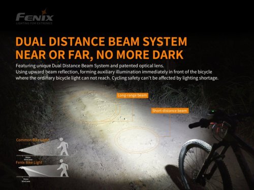 Druhá generácia extrémne výkonného svetla na bicykel Fenix BC30 V2.0 prináša svetelný tok až 2200 lúmenov (ANSI). Na napájanie je možné použiť dvojicu nabíjacích Li-ion akumulátorov 18650, (18650 bez vystúpeného plusového pólu vo svietidle majú nedostatočný kontakt) prípadne štyri jednorazové batérie CR123A. Svetelným zdrojom sú dve moderné LED Luminus SST-40. Svietidlo používa osvedčenú technológiu dvojitého smerovania svetla „Dual Distance Beam System“. Hlavný kužeľ svetla je vytváraný špeciálne navrhnutou optikou a dosvieti až do vzdialenosti 187 metrov, zatiaľ čo sekundárny široký kužeľ lúčov dotvára optický člen, ktorý je v hornej časti tvarovaný tak, že svetlo smerujúce nahor láme dole na zem. Vzniká tým kužeľ plynulo osvetľujúci celý priestor pred bicyklom - a to aj v miestach, ktoré bežné cyklistické svietidlá nepokryjú. Oproti minulej generácii je cyklosvetlo vybavené bezdrôtovým diaľkovým ovládaním, ktorým je možné meniť režimy svietenia či aktivovať Burst režim. Dizajn držiaka umožňuje rýchlu montáž aj demontáž svetla na riadidlá bez použitia náradia, držiak navyše umožňuje rýchle vybratie svietidla, takže ho možno použiť aj ako vysoko výkonné ručné svetlo. Držiak je možné použiť na všetky riadidlá s priemerom od 22 až do 32 milimetrov. K dispozícii je celkom šesť digitálne regulovaných režimov výkonu vrátane varovného blikania, nechýba ani upozornenie na vybité batérie. Cyklosvietidlo Fenix BC30 V2.0 vám zaistí kvalitné osvetlenie na nočné tréningy, pravidelné dochádzanie do práce aj na 24hodinové závody. Batérie nie sú súčasťou balenia!