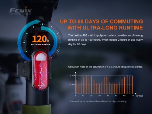 Nabíjacia červená blikačka Fenix BC05R V2.0 prináša dva stupne výkonu - 5 a 15 lúmenov. V oboch stupňoch výkonu má funkciu rýchleho blikania, pomalého blikania a konštantného svietenia. Na napájanie slúži zabudovaný lítium-polymérový akumulátor s kapacitou 400 mAh, ktorý sa nabíja cez konektor typu USB-C priamo vo svietidle. Svetelným zdrojom je päť červených LED, ktoré sú ukryté pod mierne vypuklou optikou, ktorá vytvára široký svetelný kužeľ viditeľný až pod uhlom 180 stupňov. Účinná výstražná vzdialenosť blikačky je 50 metrov, ale svetlo je viditeľné až zo vzdialenosti 230 metrov. Hmotnosť svietidla je zanedbateľných 28 gramov. Súčasťou balenia je aj spona, vďaka ktorej je možné svietidlo pripnúť na batoh, oblečenie či na popruh čelovky. Je preto možné ju použiť nielen ako zadné cyklosvetlo, ale aj ako bezpečnostné červené svetlo pri behaní a turistike.