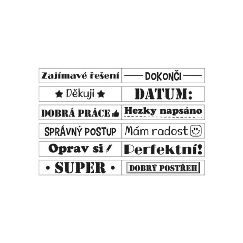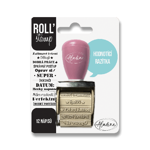 Pečiatka Roll' Stamp pre pani učiteľky a pánov učiteľa s 12 českými nápismi, ktoré ušetria čas pri kontrole úloh, písomiek i slohových prác. Funguje ako klasická dátumovka, nápis sa nastaví otočným pohybom a pečiatka sa namočí do pečiatkovacieho vankúšika – odporúčame rýchloschnúce pečiatkovacie vankúšiky Aladine Izink Quick Dry. Rozmery jednotlivých pečiatkovacích plôch sú 28 x 6 mm.
