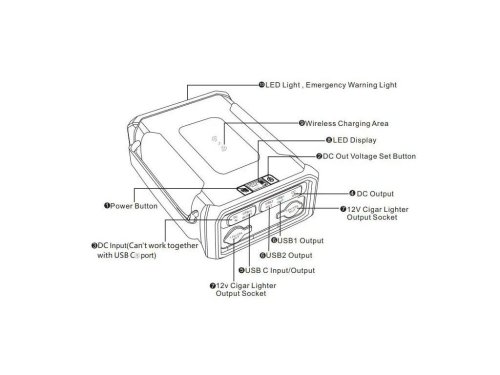 Výstupy: • 2 x cigaretová zásuvka: 12 V/15 A (max) • 2 x USB-A: 5 V/3 A, 9 V/2 A, 12 V/1.5 A (18 W max) • USB-C: 5 V/3 A, 9 V/3 A, 12 V/3 A, 15 V/3 DC-JACK (5.5/2.1mm): 12/5A, 16.5V/4A, 20V/3.5A, 24V/3.5A (84 W max) • WIRELESS (Qi): 10 W