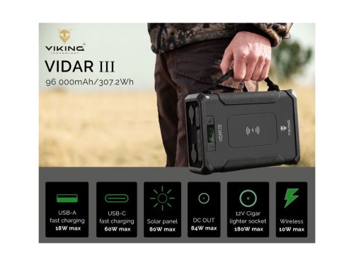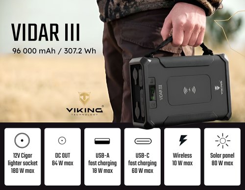 Outdoorová powerbanka Viking VIDAR III je výkonný a odolný záložný zdroj energie navrhnutý na použitie v prírode, na cestách aj v náročných pracovných podmienkach. Vďaka robustnej konštrukcii, veľkej kapacite a rozmanitej ponuke výstupov je ideálny na kempovanie, prácu v teréne aj každodenné použitie.