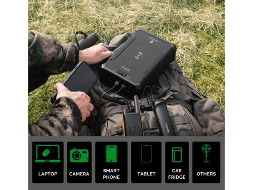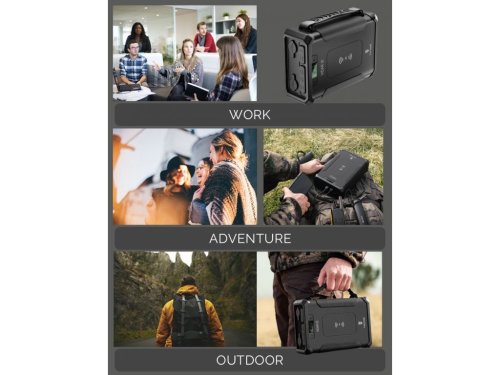 Kľúčové vlastnosti: • Kapacita batérie 96000 mAh (307.2Wh) • Rýchle nabíjanie cez USB-C alebo DC-JACK (nabíjací výkon až 80 W) • Wireless bezdrôtové nabíjanie (10 W) • Fukcia Pass-Through umožňuje súčasné nabíjanie aj používanie powerbanky • Používanie powerbanky ampéroch • Powerbanku je možné nabiť solárnym panelom s výkonom až 80 W • Možnosti nastavenia výstupného napätia • Ideálne pre napájanie mobilov, tabletov notebookov a ďalšie bežné elektroniky • Vďaka zabudovanému LED svetlu poslúži aj ako núdzové svietidlo • Hmotnosť cca 3 kg a praktické rozmery pre ľahký transport