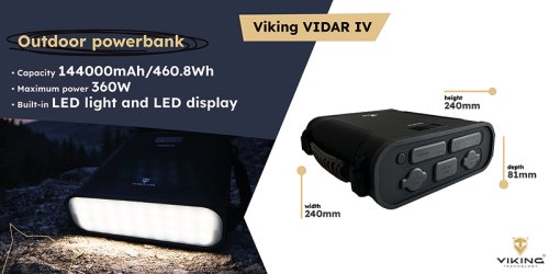 Outdoorová powerbanka Viking VIDAR IV • Kapacita: 144000mAh/460.8Wh • LED displej • Maximálny výkon: 360W • Zabudované LED svetlo • Široká škála vstupov a výstupov (USB-A, USB-C, Cigaretová zásuvka, DC-jack, Small Anderho