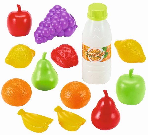 Makety potravín v sieťke. Sieťka obsahuje celkom 13 doplnkov - 2 citróny, jahodu, 2 pomaranče, 2 jablká, 2 hrušky, 2 trsy banánov, strapec vína a fľašu pomarančového džúsu. Ideálne aj ako vybavenie obchodu alebo ako doplnok do detskej kuchynky. Rozmery produktu (DxŠxV): 16 x 16 x 13 cm.