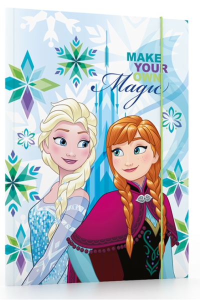 Kartónová sloha s motívom obľúbenej rozprávky Ľadové kráľovstvo, na uchovávanie dokumentov formátu A4, so zaisťovacou gumičkou, 3 chlopne.