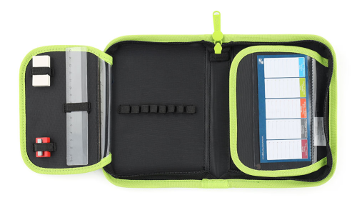 jednoposchodový školský peračník s dvoma chlopňami bez náplne gumové pútka na uchytenie písacích potrieb na vnútornej chlopni je priehľadná fólia pre rozvrh hodín