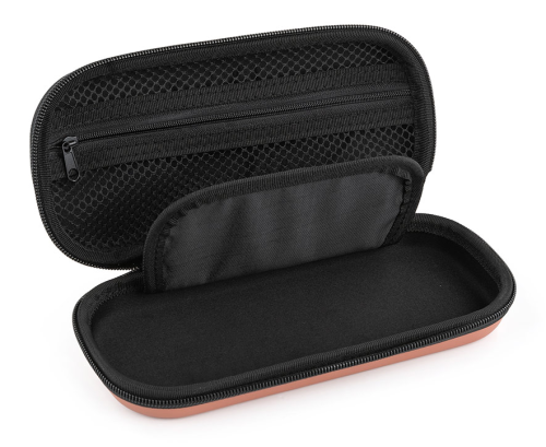 má jedno hlavné vrecko a jedno menšie vrecko opatrené sieťkou pod chlopňou je miesto pre voľné uloženie písacích potrieb alebo iných drobností puzdro je opatrené pevnými zipsami
