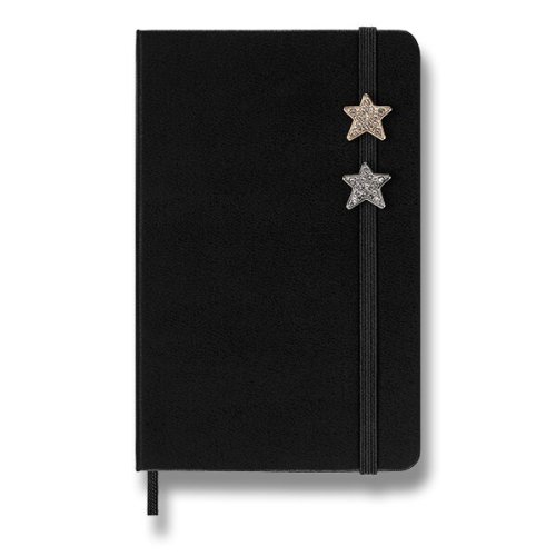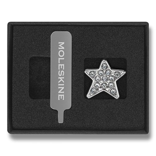 Balenie obsahuje:, - ozdobu, - kovovú skrutku na upevnenie symbolu ku gumičke zápisníka, - špeciálny skrutkovač, - návod na použitie (v anglickom jazyku), Vyrobené zo zliatiny zinku., [ https://www.moleskine.com/dw/image/v2/BFRN_PRD/on/demandware.static/-/Sites-masterCatalog_Moleskine/default/dw3cbd5904/images/lifestyle/pins_mood_02.jpg?sw=328&sh=32