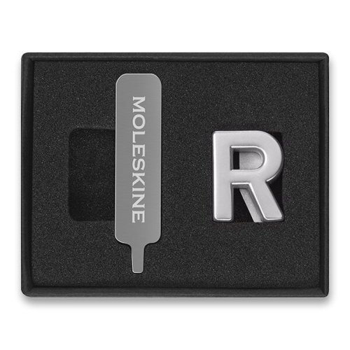 Balenie obsahuje:, * ozdobu = písmeno na personifikáciu zápisníka alebo diára, * kovová skrutka na upevnenie ozdoby ku gumičke zápisníka alebo diára, * špeciálny skrutkovač, * návod na použitie (v anglickom jazyku), Vyrobené zo zliatiny zinku.