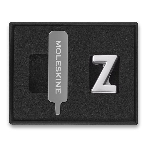 Balenie obsahuje:, * ozdobu=písmeno na personifikáciu zápisníka alebo diára, * kovovú skrutku na upevnenie ozdoby ku gumičke zápisníka alebo diára, * špeciálny skrutkovač, * návod na použitie (v anglickom jazyku), Vyrobené zo zliatiny zinku