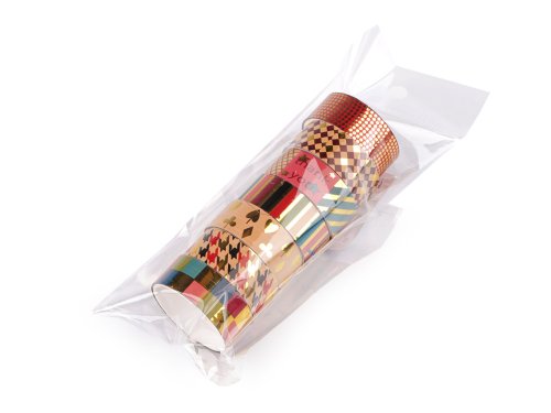 Súprava lepiacich pások, ktoré sú ozdobené lesklými metalickými detailmi. Využijete ich na všetkých hladkých materiáloch, ako je drevo, plast, papier, sklo, atď. Môžete s nimi ozdobiť darčeky a krabičky či ich nalepiť na priania, albumy, foto rámčeky, do diára a pod. Vďaka samolepiacej vrstve sú veľmi ľahko použiteľné, sú pevné, nedajú sa trhať. Súprava obsahuje 7 ks opasok s rôznym dizajnom. Každý kotúčik obsahuje cca 1,7 m pásky. Veľké balenie 24 ks opasok je zabalené v papierovej krabičke s transparentným vekom. Krabička má rozmery 12 x 16,5 x 4 cm.