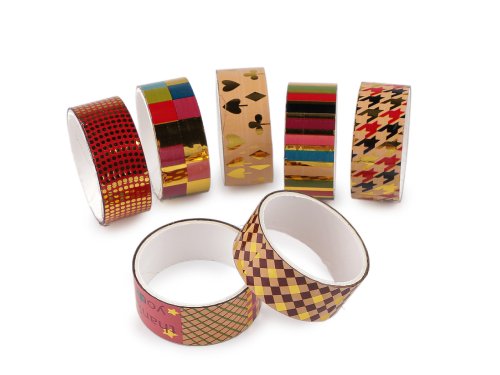 Súprava lepiacich pások, ktoré sú ozdobené lesklými metalickými detailmi. Využijete ich na všetkých hladkých materiáloch, ako je drevo, plast, papier, sklo, atď. Môžete s nimi ozdobiť darčeky a krabičky či ich nalepiť na priania, albumy, fotorámiky, do diára a pod. Vďaka samolepiacej vrstve je veľmi ľahko použiteľná, je pevná, nedá sa trhať. Súprava obsahuje 7 ks opasok s rôznym dizajnom. Každý kotúčik obsahuje cca 1,7 m pásky. Veľké balenie 24 ks opasok je zabalené v papierovej krabičke s transparentným vekom. [Krabička má rozmery 12 x 16,5 x 4 cm.]