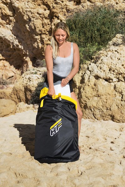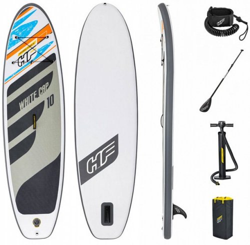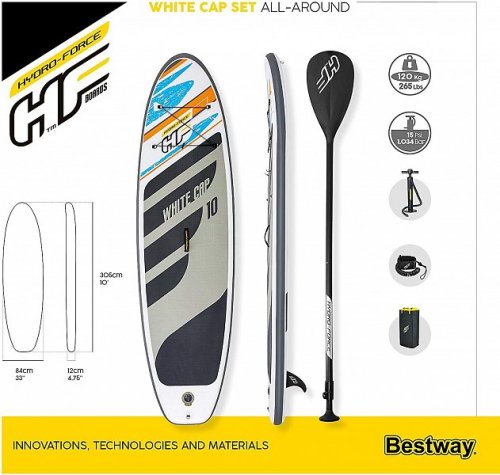 Paddle Board White Cap Set má optimálny tvar na jazdu na pokojnej vode a malých vlnách. Materiál so zapustenými švami. Prenosný, skladný a vyznačuje sa pevnosťou porovnateľnou s pevnými doskami. Protišmyková úprava vrchnej plochy. Praktická rukoväť na hornej strane na prenášanie dosky. Elastické lanko na upevnenie batožiny. Nastaviteľné pádlo 2,17 m. Počet osôb: 1 dospelá osoba. Nosnosť: 120 kg. Rozmer: 3,05 mx 84 cm x 12 cm. Obsahuje: 1 paddle board, 1 pádlo, 1 ručná pumpa, 1 cestovná taška, 1 elastické lanko, 1 stredová plutva, sada na opravy.