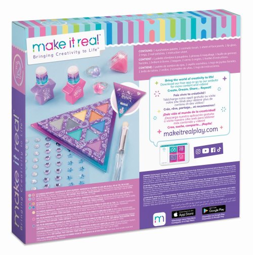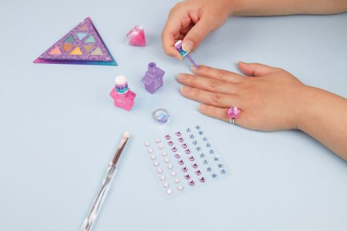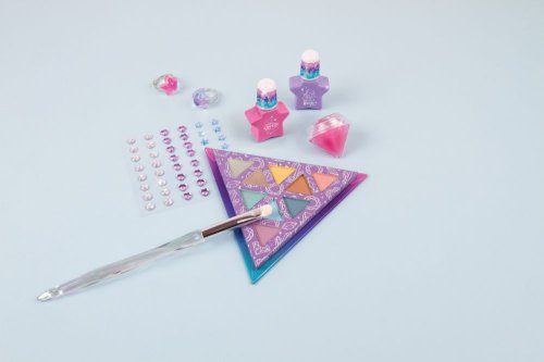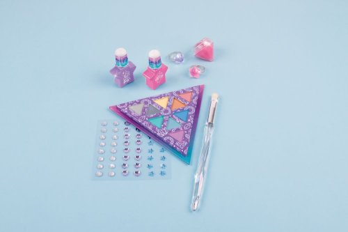 Paletka trblietavých očných tieňov. Trblietavé aplikácie, ktoré môžete použiť na to, aby ste boli šik. Sada obsahuje 1 paletku očných tieňov, 1 kozmetický štetec, 1 hárok ozdobných kryštálov na tvár, 1 lesk na pery, 2 prstienky a 2 laky na nechty. Balené v krabici. Vhodné pre deti od 8 rokov. Laky na nechty sú na vodnej báze a dajú sa odstrániť jemným trením teplou vodou a mydlom.